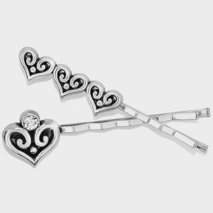 Featuring the same filigree hearts as our Alcazar jewelry collection, these sweet silver-plated bobby pins are romantic and feminine, one with a fine quality crystal, the other a trio of hearts.