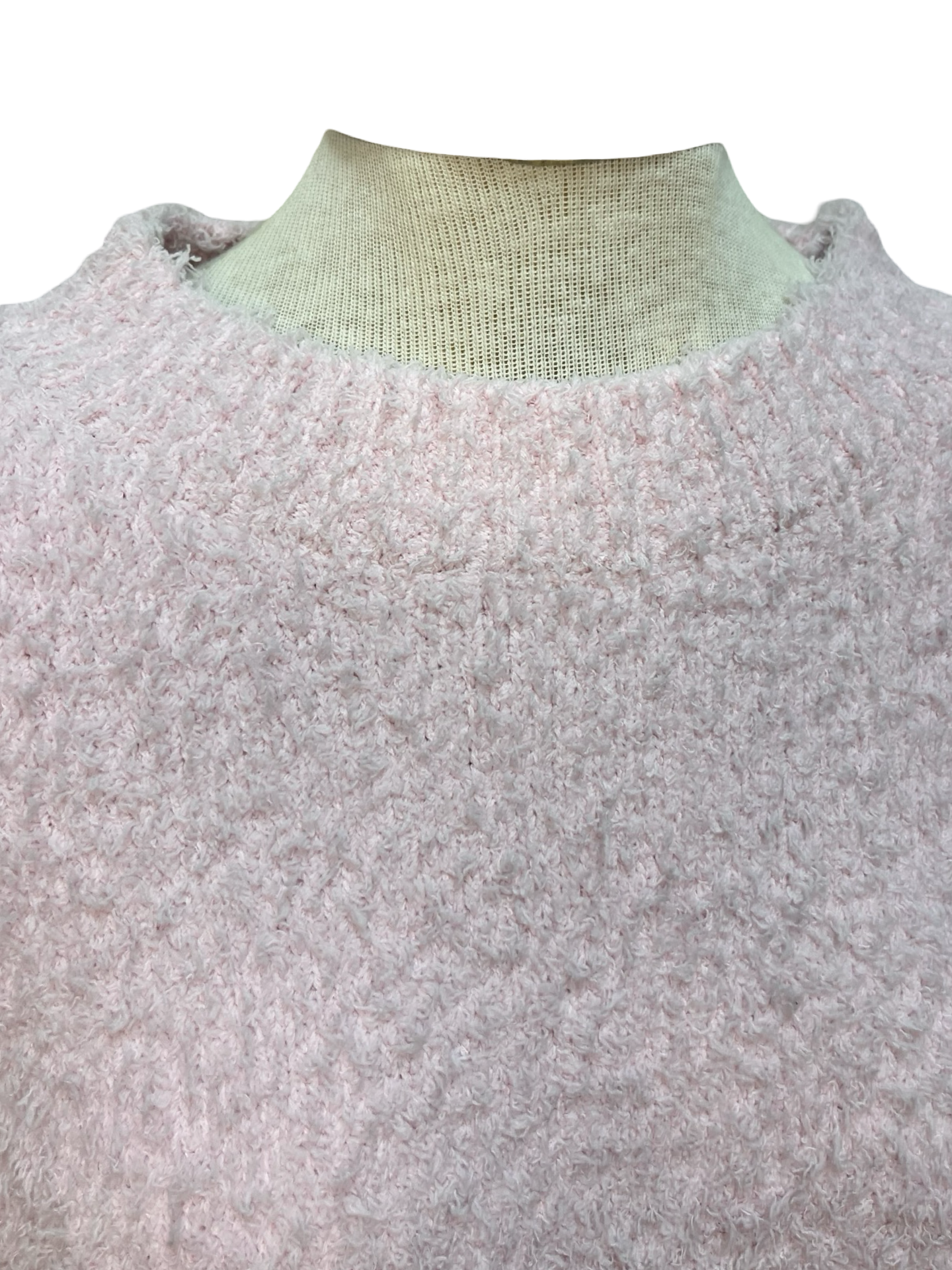 Women’s pink bouclé long sleeve top with crew neckline and ribbed trim.