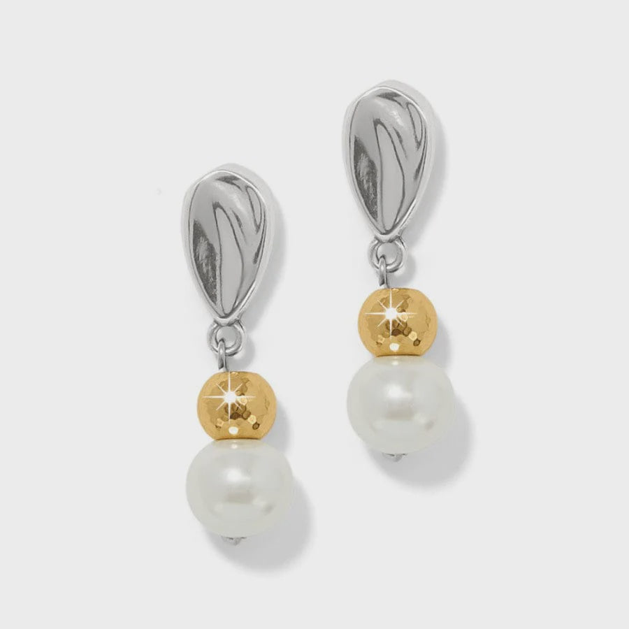 Inspired by modern metal sculptures and fluid automotive designs of the past, these earrings with golden and pearl accents can take you from day to evening with their fluid grace.