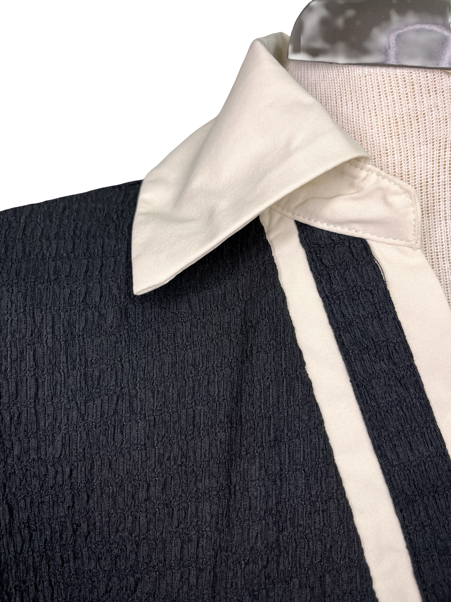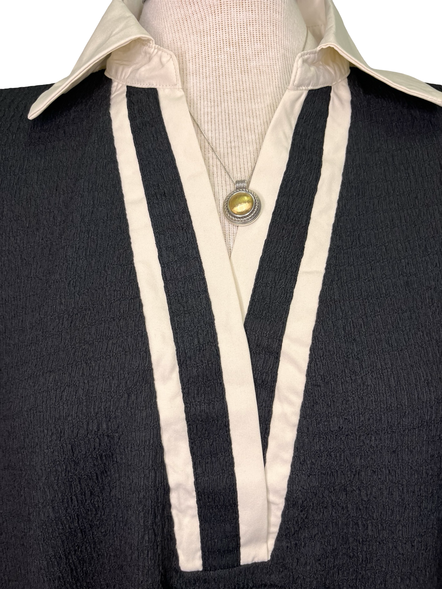 Classic tailoring meets modern texture in this standout short sleeve top. Designed with a wide cream collar that extends gracefully down the V-neckline, it adds a crisp, structured touch to the soft silhouette. The half sleeves are finished with a cream band at the hem, offering a subtle contrast that elevates the look. Crafted from textured woven material, this piece blends comfort with sophistication.