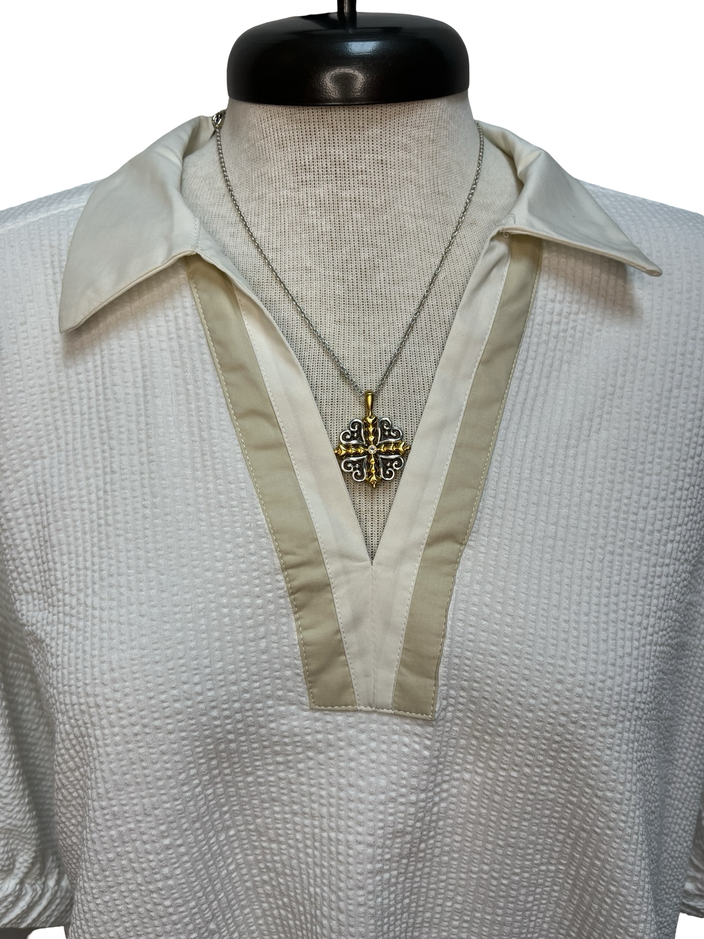 Clean lines meet effortless sophistication in this Contrast Collar V‑Neck Top, a polished essential that elevates everyday dressing. The deep V‑neckline is framed by a striking contrast collar, giving the silhouette a modern, tailored touch while keeping the overall feel relaxed and wearable. Lightweight and unlined, it drapes beautifully thanks to its soft rayon‑blend fabric.