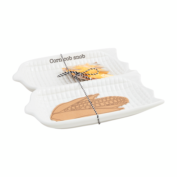 Corn On The Cob Platter Set is a delightful 2-piece set designed to enhance your dining experience. The set features a beautifully crafted corn on the cob textured ceramic platter, perfect for holding and serving delicious ears of corn. The platter measures 9 3/4" x 9 1/2", providing ample space for your corn servings. Accompanying the platter are six durable skewers made of plastic and metal, each measuring 2 1/4", ensuring a secure grip for easy handling. Made from high-quality dolomite, this set combines functionality with a charming design, making it an ideal addition to your kitchen or dining table.