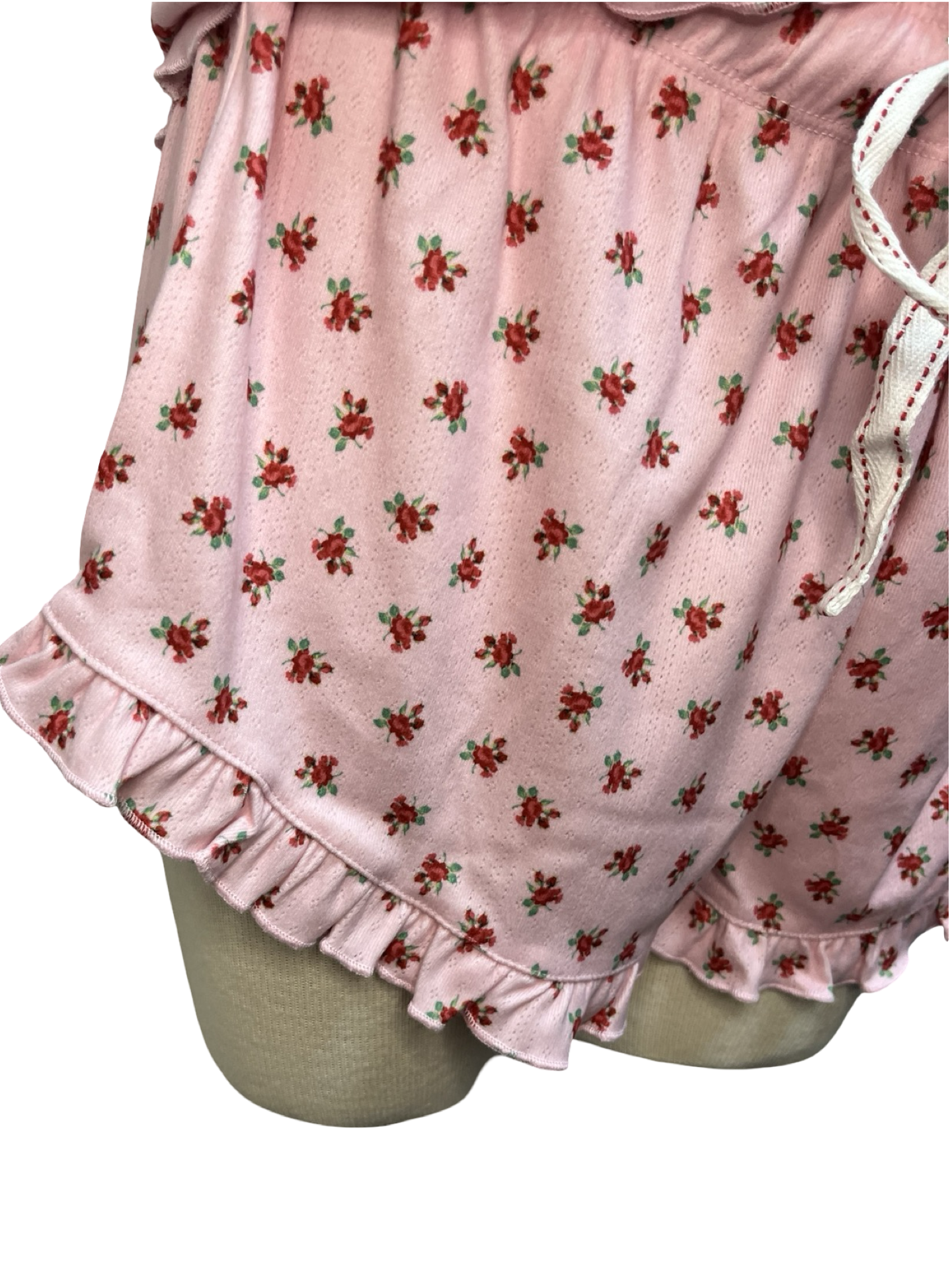 Women’s pink pointelle pajama set with floral tank top, drawstring shorts, and ruffle trim.