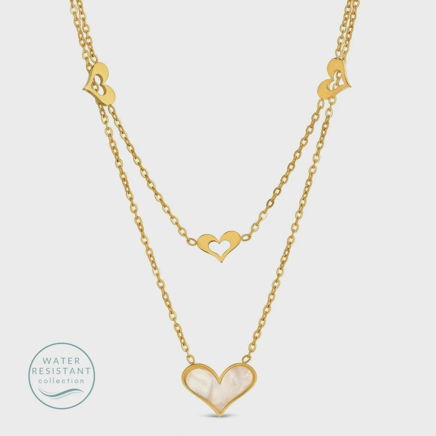 This beautifully designed necklace features two perfectly layered chains. The first layer showcases a delicate chain adorned with dainty heart charms, adding a subtle touch of romance. The second, longer layer proudly displays a unique heart-shaped shell pendant, bringing a touch of organic beauty and coastal charm to this already stunning piece. The combination creates a harmonious, layered look that's both meaningful and effortlessly chic. Add this waterproof gold necklace to your collection today and let your style speak volumes!