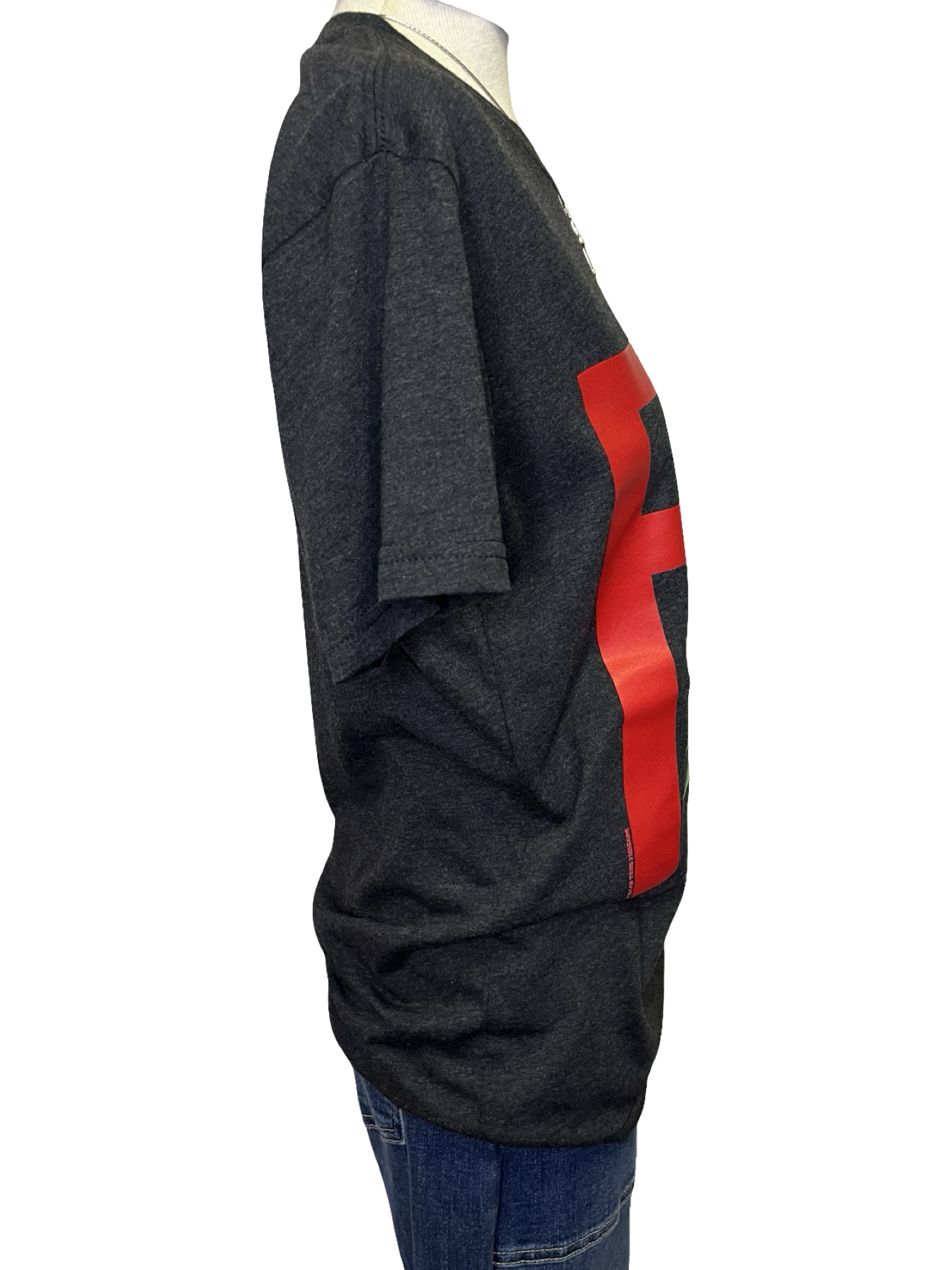 On a Bella Canvas charblack t-shirt.