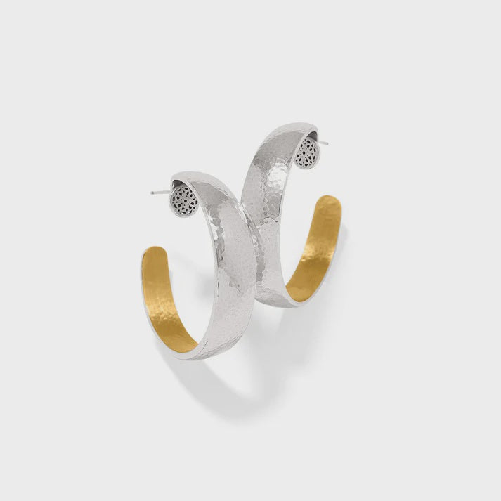 The Entrata jewelry including these two-tone small hoop earrings exudes pure luxury. All the curvaceous sculpted details of designer Carmen Radulescu’s hand sketch have been brought to life by our artisans. Enhanced by softly hammered details, each piece is modern art-to-wear – breathtaking from every perspective.