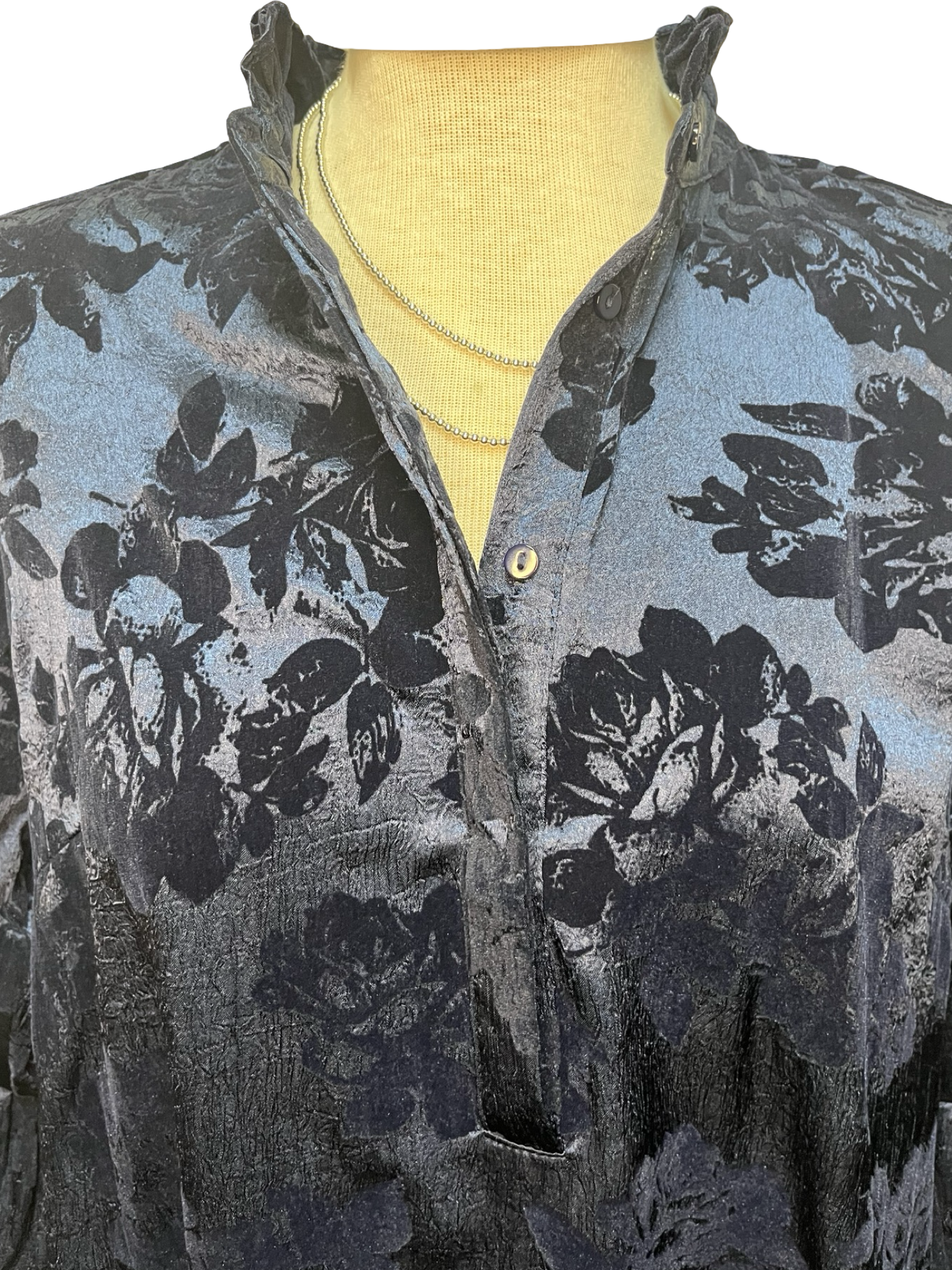 Make a statement in this romantic and radiant Ruffled Neck Bubble Sleeve Dress. Designed with a lustrous finish and adorned with a velvet-feel floral pattern, this piece blends texture and shine for a truly captivating look. The ruffled neckline adds a touch of vintage charm, while the voluminous bubble sleeves bring playful drama to the silhouette.
