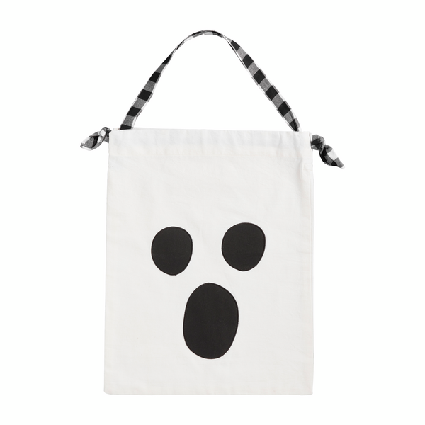 Get your kiddos ready for trick-or-treating with our ghost Halloween pillowcase bag. The cotton drawstring pillowcase features an applique. The pillowcase bag features a white background with a black ghost face in the center. The bag also features a black plaid strap for easy carrying.
