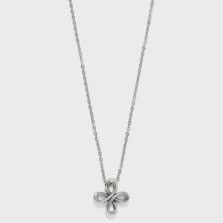 One single strand of metal creates this endless four loop necklace, resembling a flower, a butterfly or a cross; it’s up to the viewer to decide. Small in size, it is a perfect complement to wear layered with other silver necklaces, or simply solo.