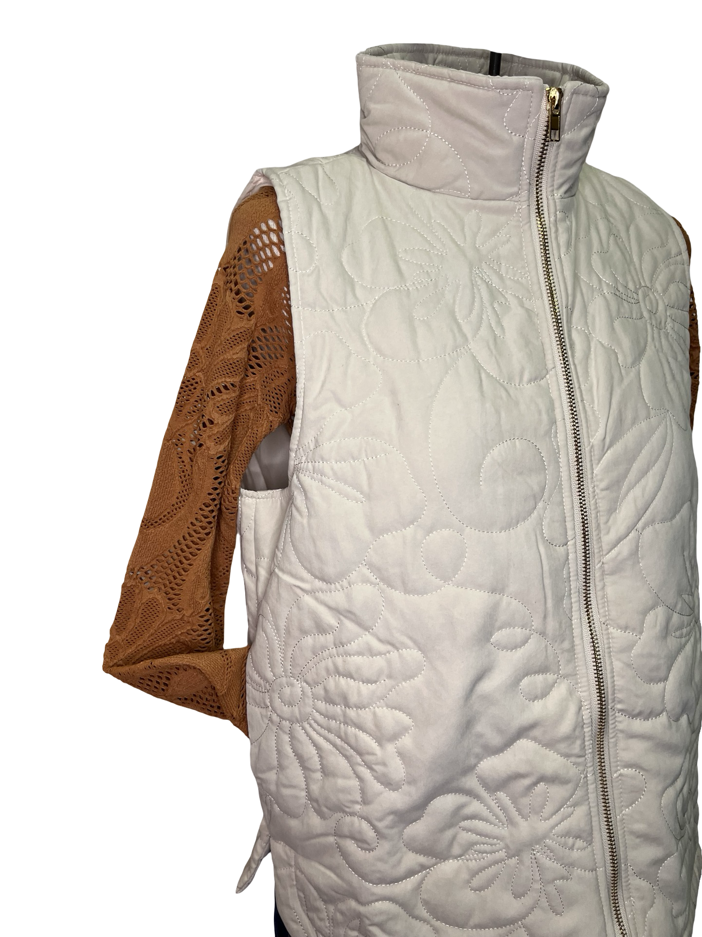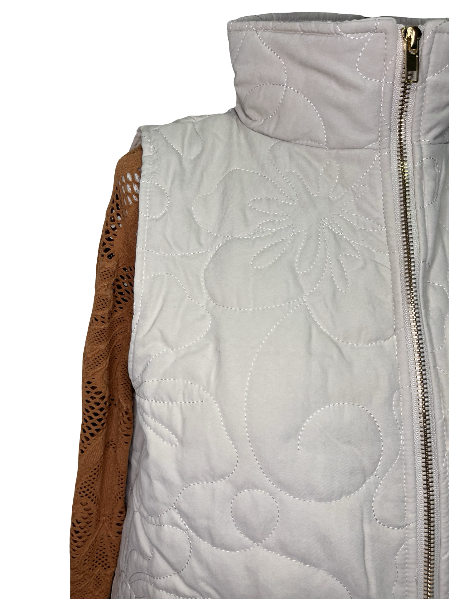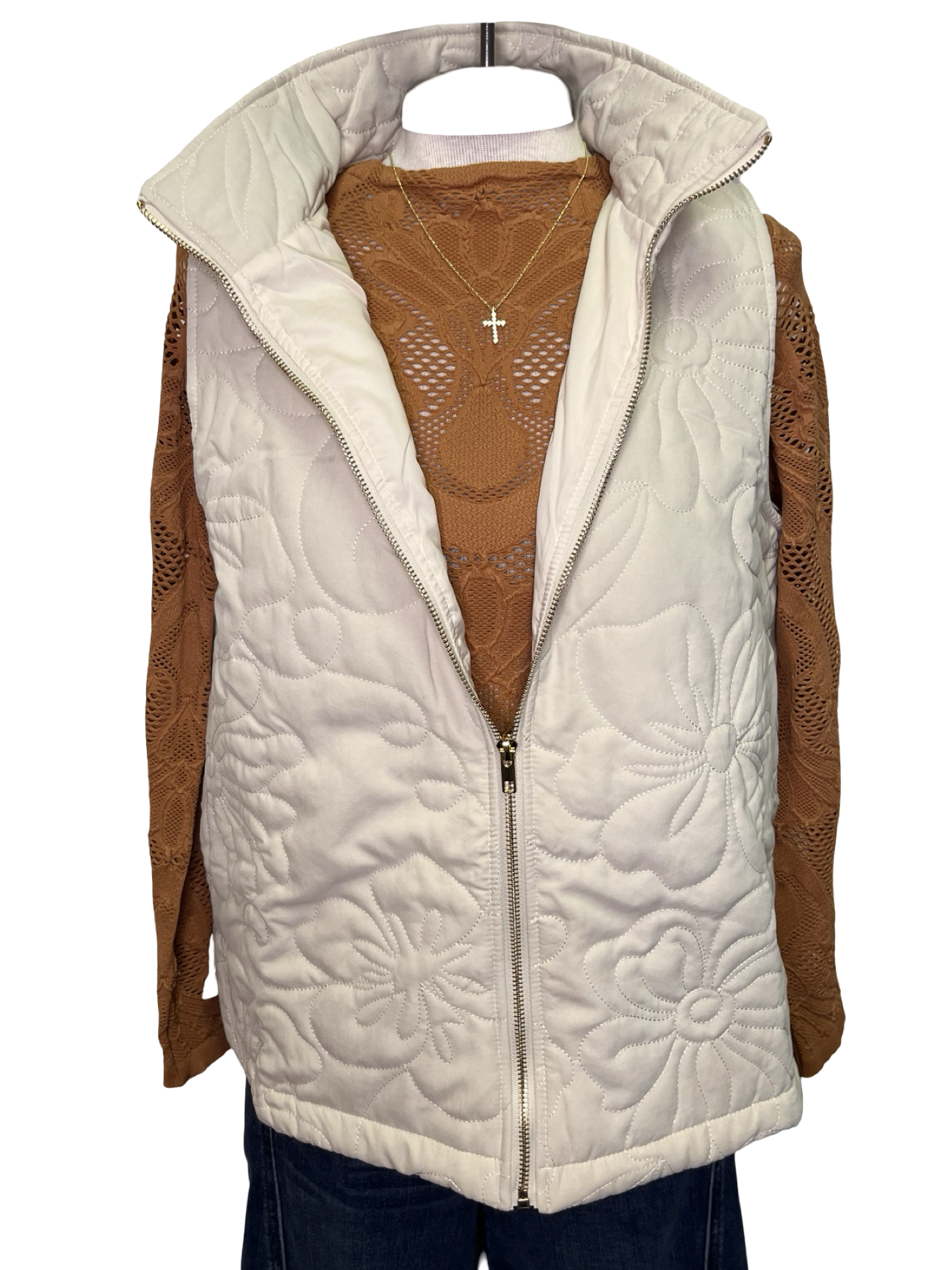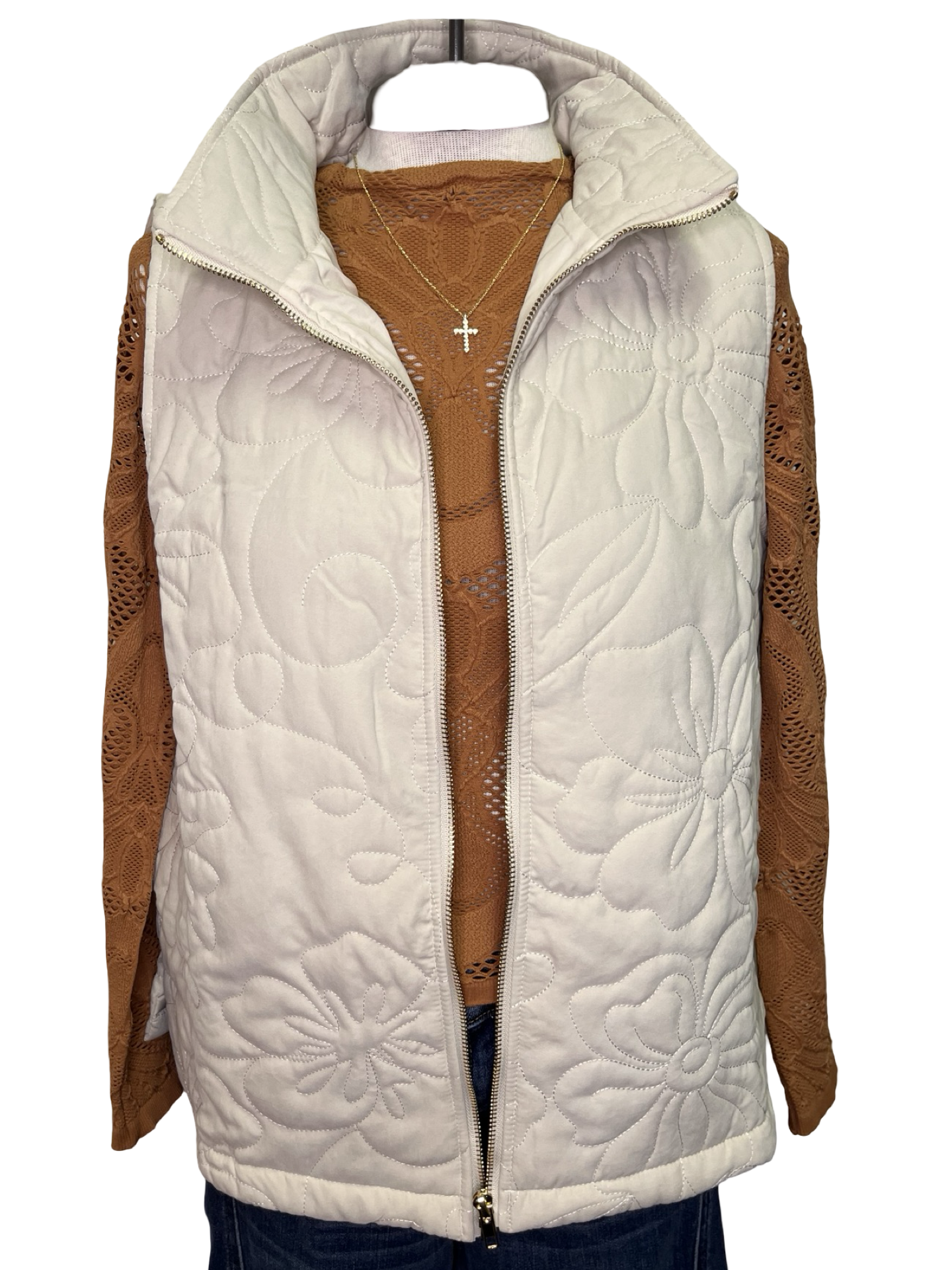 Elevate your layering game with this charming Quilted Floral Zip Vest, where cozy meets chic. Designed with delicate floral quilt stitching, this vest adds a touch of elegance to any casual outfit. The stand collar and front zipper offer both style and functionality, while the lined interior ensures lightweight warmth and comfort.