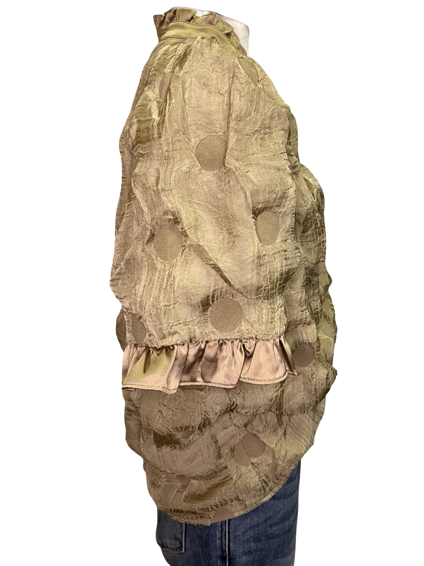 Elevate your everyday style with this effortlessly chic satin top, crafted to turn heads with its delicate details and sophisticated silhouette. The dotted textured woven fabric adds subtle dimension, while the high-banded V-neckline creates a flattering frame. Short sleeves are finished with contrast ruffle cuffs, echoing the romantic ruffle detail at the neckline for a touch of playful elegance.