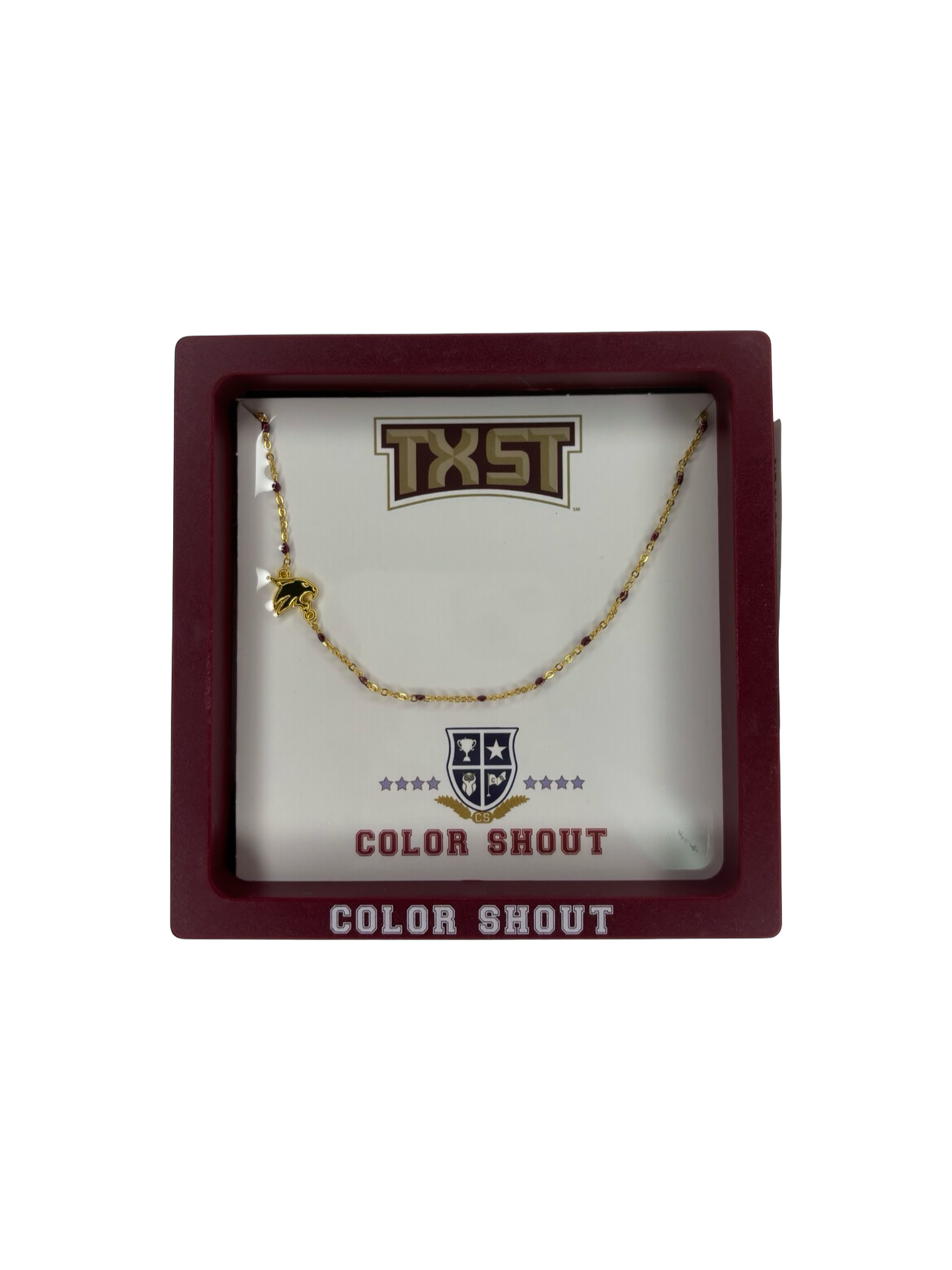 16-18 inch adjustable necklace. stainless steel plated in 18k yellow gold accented with burgundy enamel and side set logo.