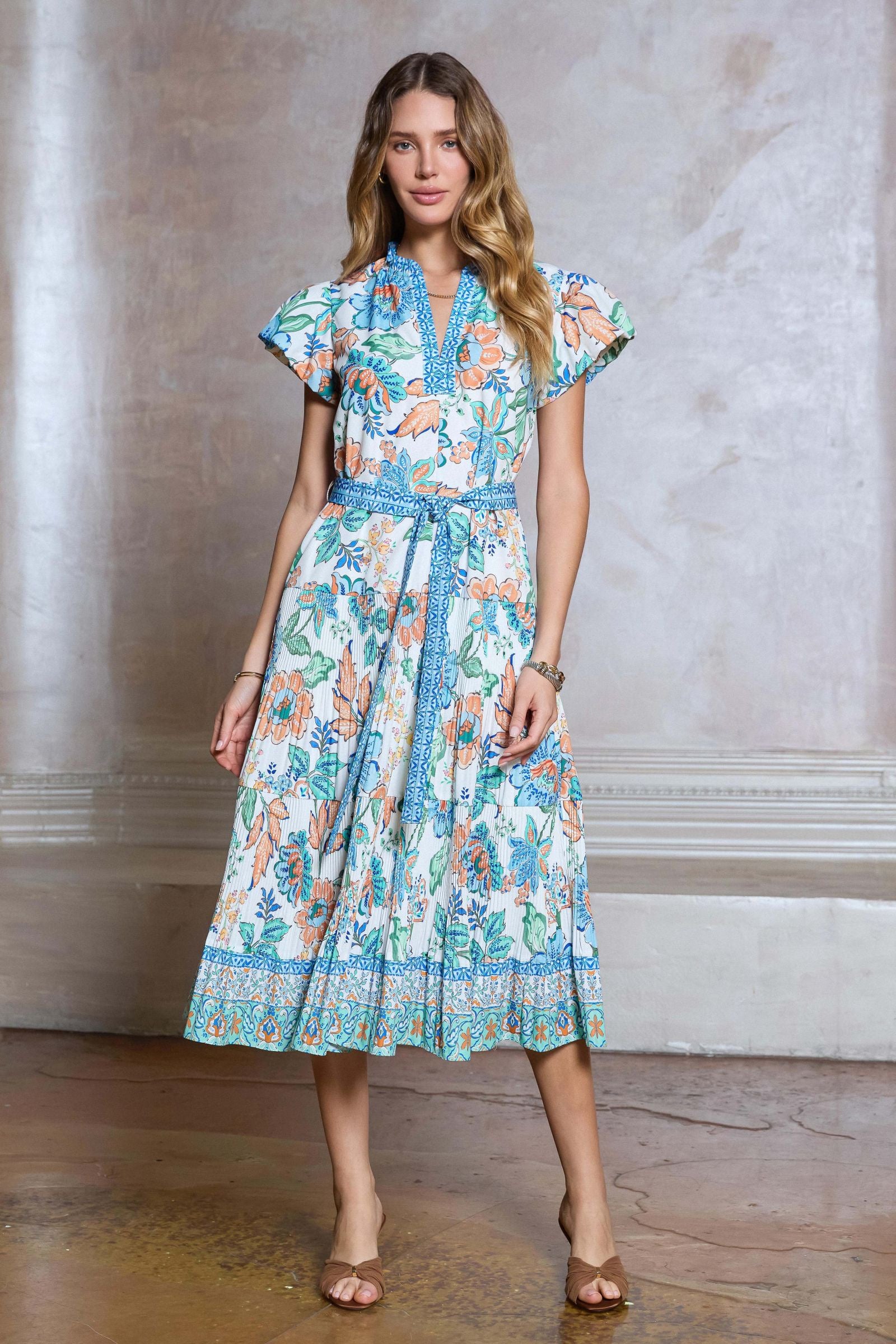 The standout feature is the pleated tiered midi skirt, offering graceful flow and an A‑line silhouette that flatters every figure. Fully lined for comfort and finished with premium digital printing, this dress is perfect for spring events, daytime outings, or any moment that calls for effortless elegance.